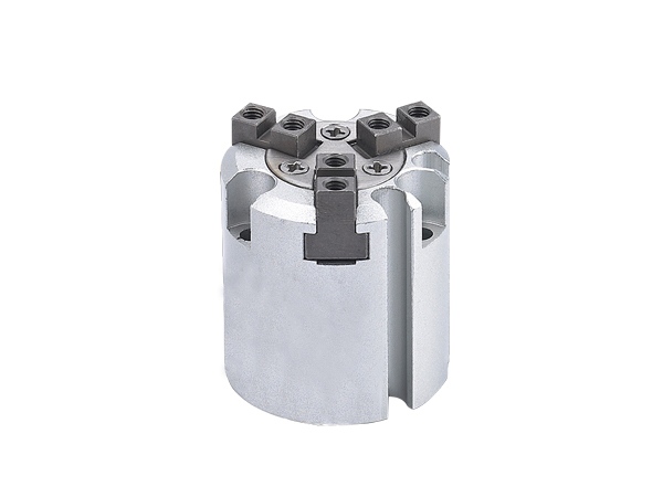 旋轉(zhuǎn)夾爪的動作是按照齒條的嚙合原理工作的。活塞與一根可上下移動的軸固定在一起。軸的未端有三個環(huán)開槽,這些槽與兩個驅(qū)動輪的嚙合。因而,氣動手指可同時移動并自動對中,齒輪齒條原理確保了抓取力度始終恒定。??